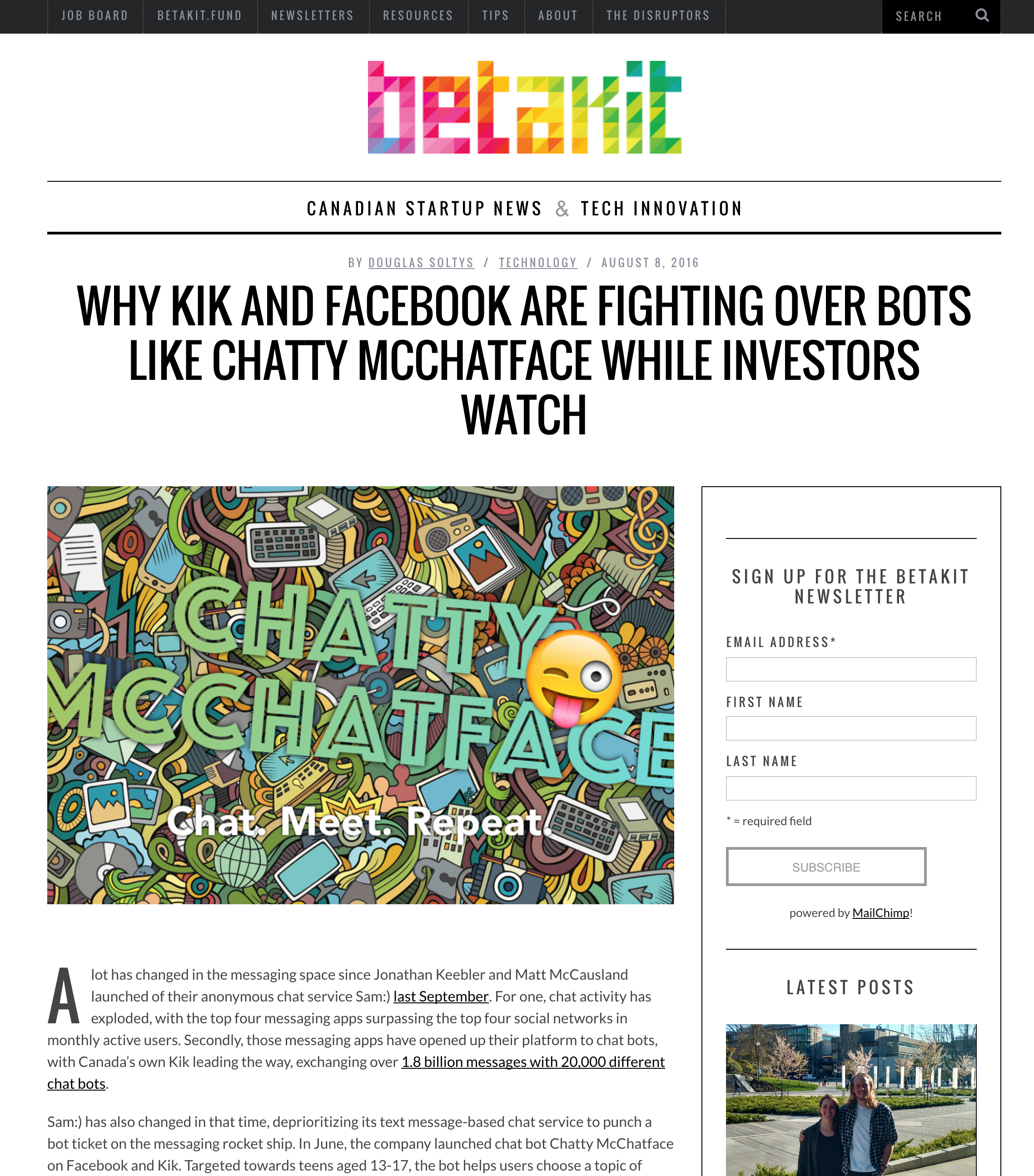We're in the news again with our latest product, Chatty McChatface on Kik.